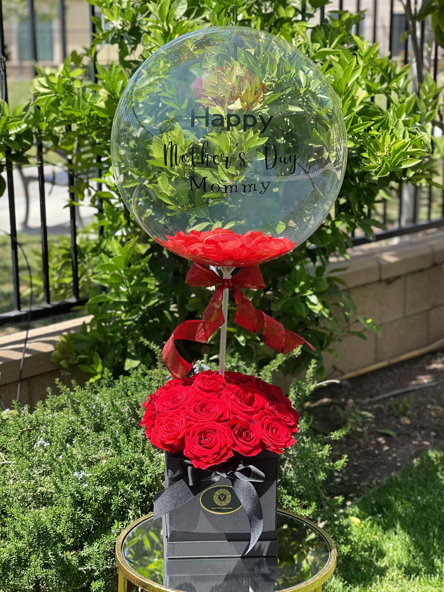 - This arrangement measures approximately 8"H x 8"W and with the balloon approximately 24"H.